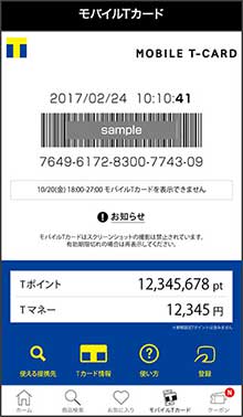 - ※モバイルTカードに対応していないTポイント提携先、Tマネー加盟店ではTカードの提示が必要です。
